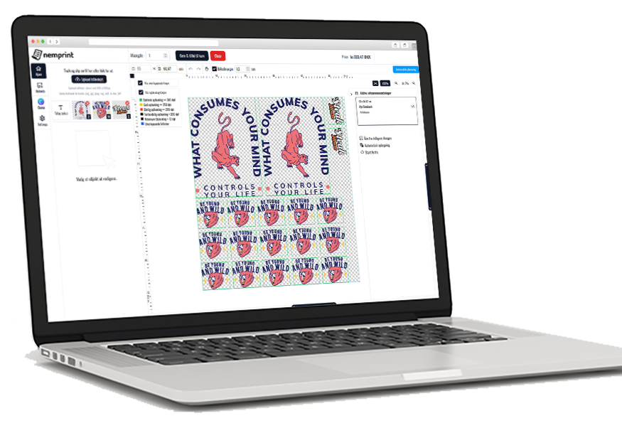 Laden Sie Ihr eigenes Gruppierungsblatt als PDF oder PNG hoch und bestellen Sie DTF-Transfers für Textilprodukte. Die Preise werden automatisch anhand der gewählten Länge berechnet. Je mehr Meter Sie bestellen, desto mehr sparen Sie.